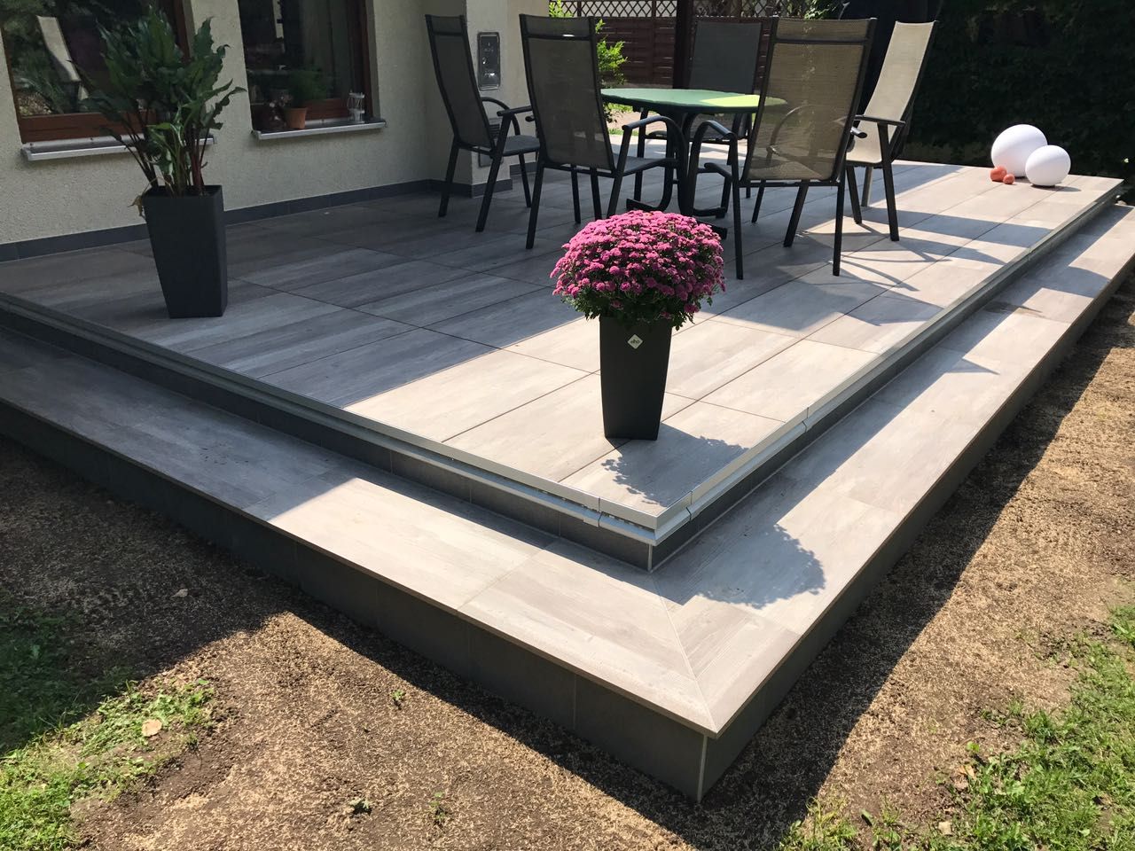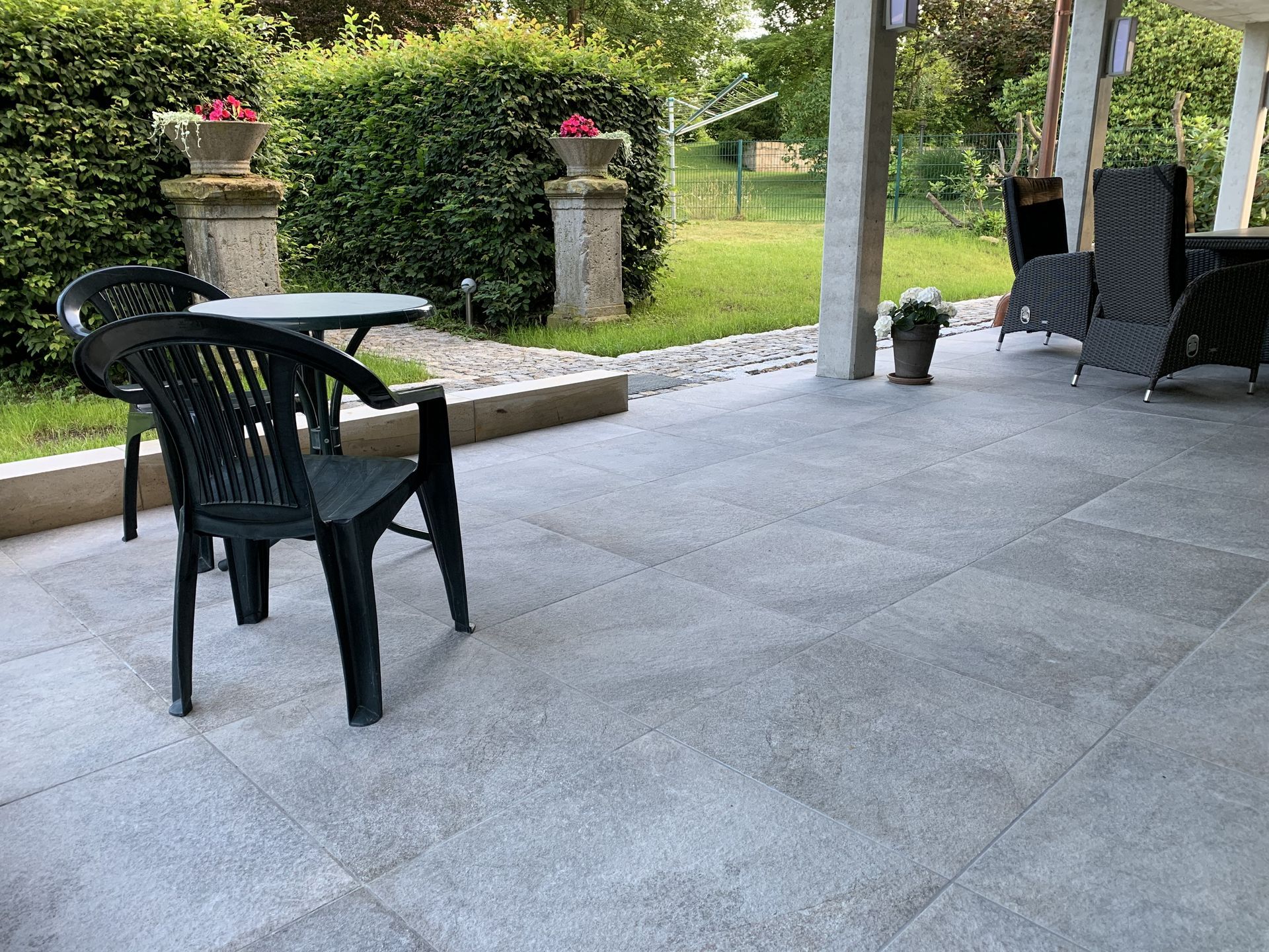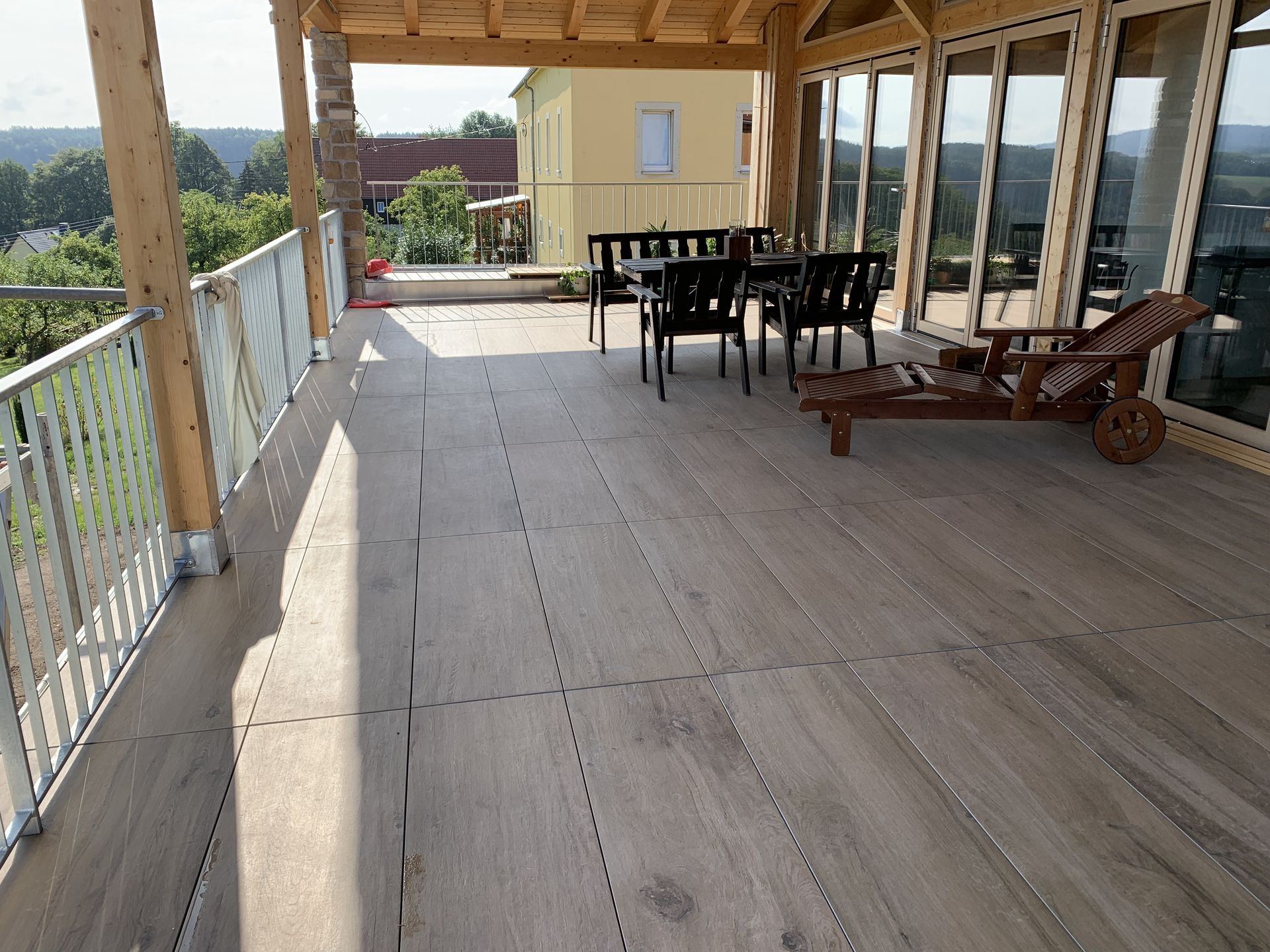 - Verlegung von Fliesen, Terrassenplatten oder Naturstein als Festverlegung, auf Stelzlager oder im Kiesbett