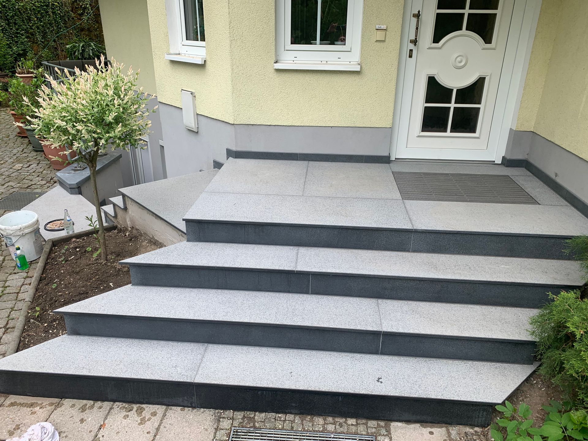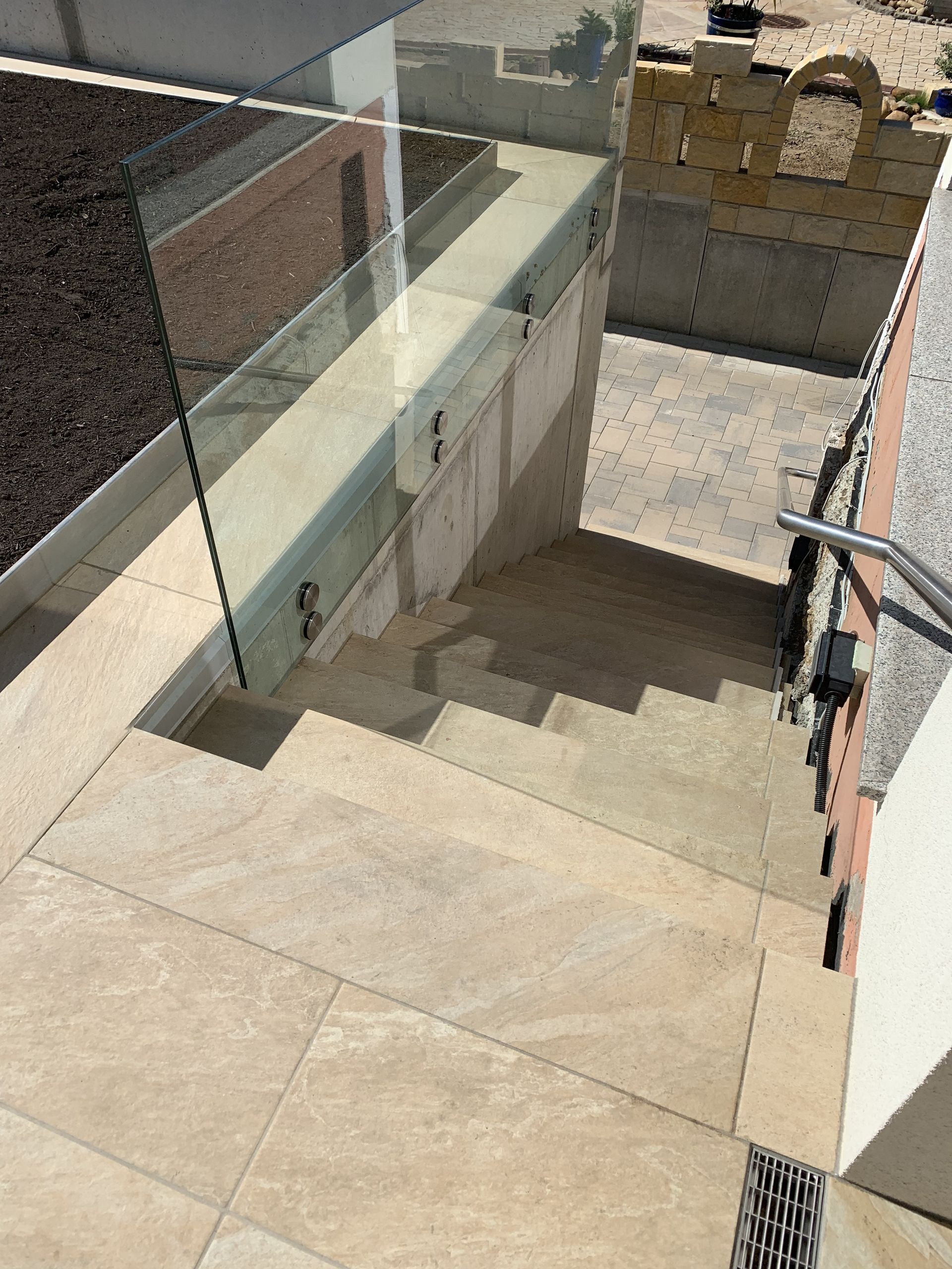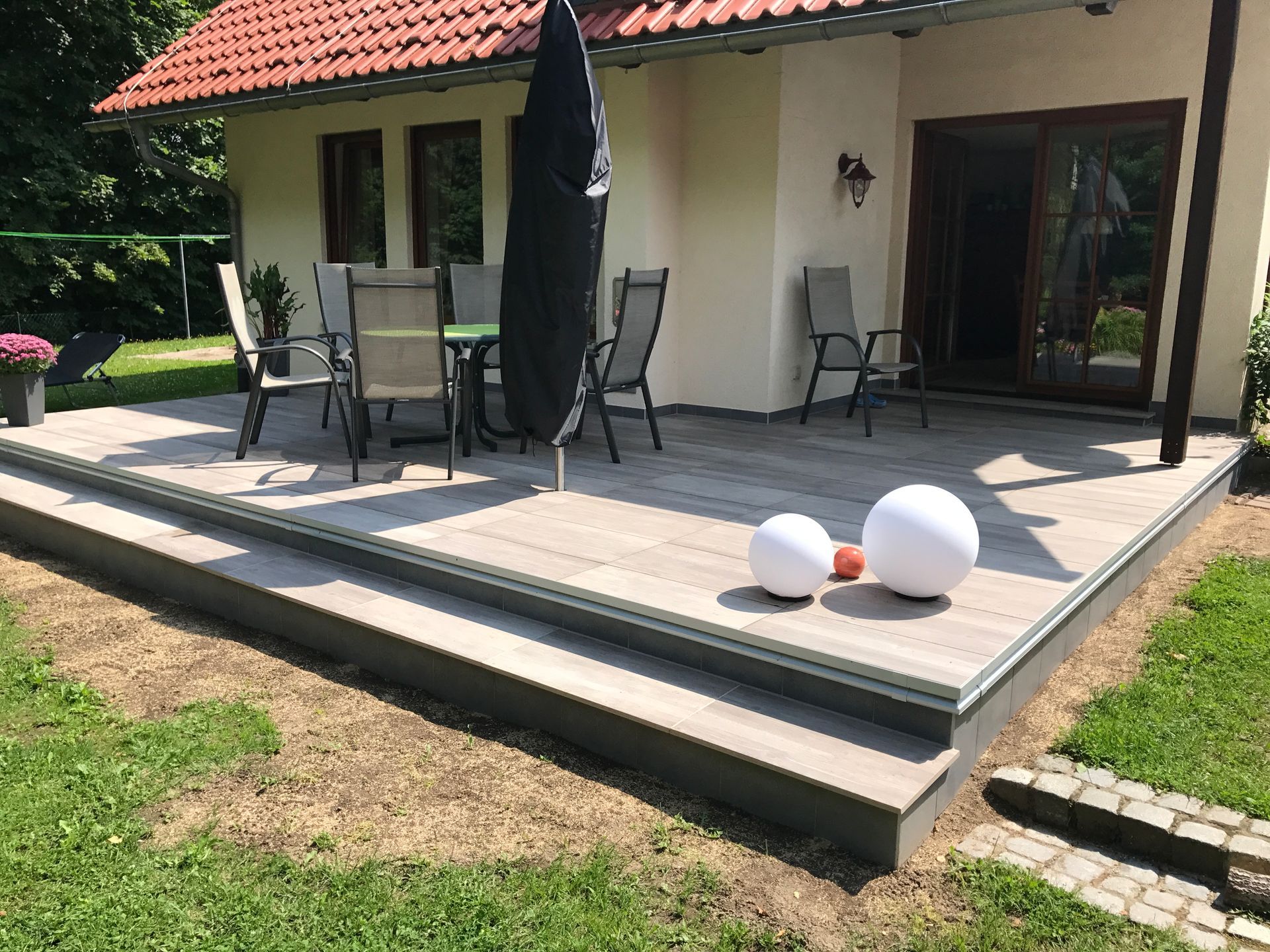 - Verlegung von Fliesen, Terrassenplatten oder Naturstein als Festverlegung, auf Stelzlager oder im Kiesbett